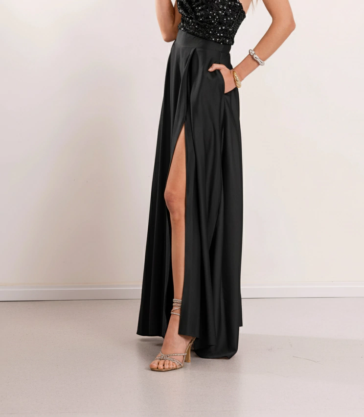 Maxifalda de crepe sedoso con caída fluida y textura suave. Presenta un tajo lateral que aporta movimiento, bolsillos laterales integrados y cierre trasero invisible para un calce limpio.